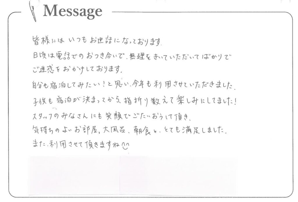 「皆様にはいつもお世話になっております。日頃は電話でのおつき合いで、無理をきいていただいてばかりで、ご迷惑をおかけしております。自分も宿泊してみたい!と思い、今年も利用させていただきました。子供も宿泊が決まってから、指折り数えて楽しみにしていました。スタッフのみなさんにも笑顔でごたいおうして頂き、気持ちのよいお部屋、大風呂、朝食ととても満足しました。また、利用させて頂きますね」 この度はご宿泊頂きまして、誠にありがとうございます。またアンケートのご協力もありがとうございます。今後も、お客様にお喜びいただけるサービスの提供をして参ります。 またのご来館を、従業員一同、心よりお待ち申し上げます。