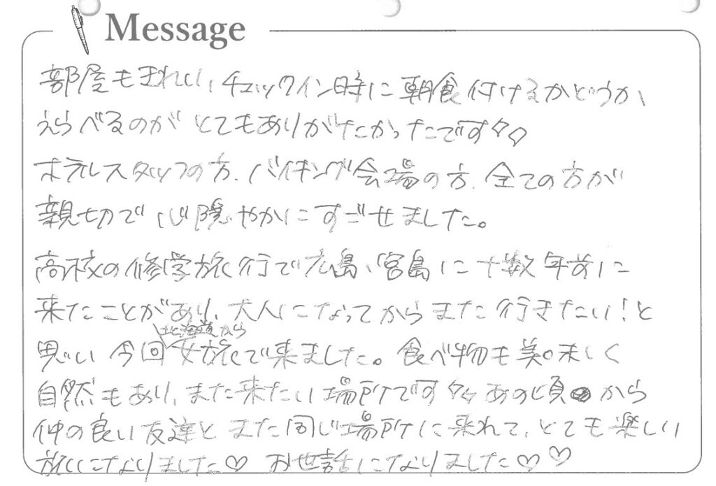 「部屋もきれい、チェックイン時に朝食付けるかどうかえらべるのがとてもありがたかったです。ホテルスタッフの方、バイキング会場の方、全ての方が親切で心穏やかにすごせました。高校の修学旅行で広島・宮島に十数年前に来たことがあり、大人になってからまた行きたい!と思い今回北海道から女旅で来ました。食べ物も美味しく自然もあり、また来たい場所です。あの頃から仲の良い友達とまた同じ場所に来れて、とても楽しい旅になりました。お世話になりました。」