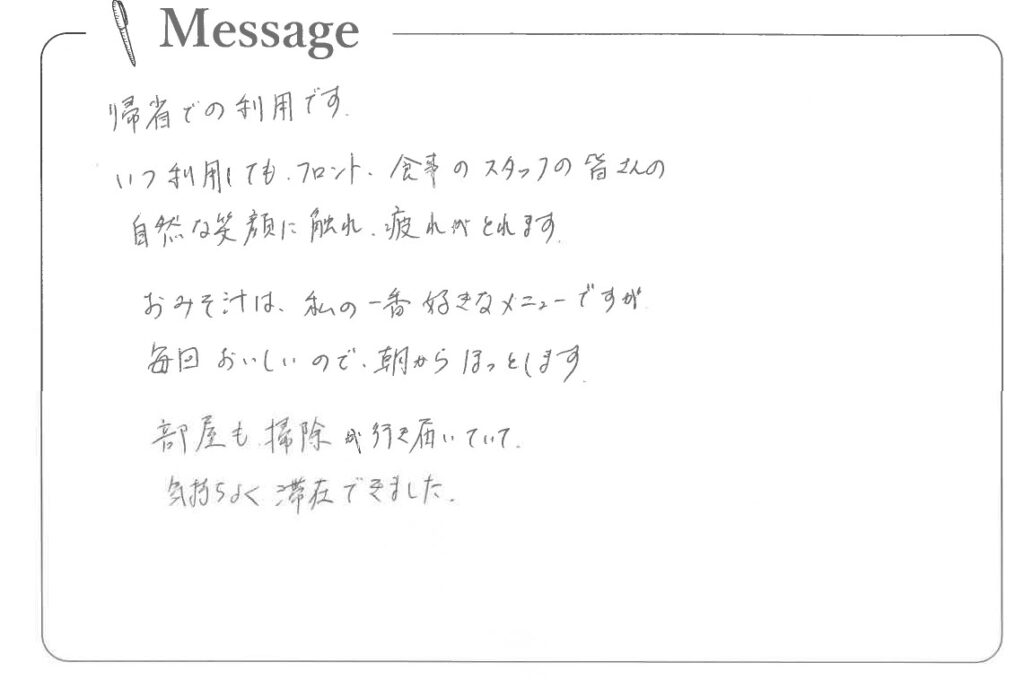 「帰省での利用です。いつ利用しても、フロント、食事のスタッフの皆さんの自然な笑顔に触れ、疲れがとれます。おみそ汁は、私の一番好きなメニューですが、毎回おいしいので、朝からほっとします。部屋も掃除が行き届いていて、気持ちよく滞在できました。」